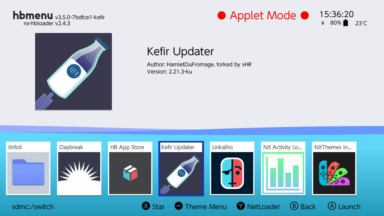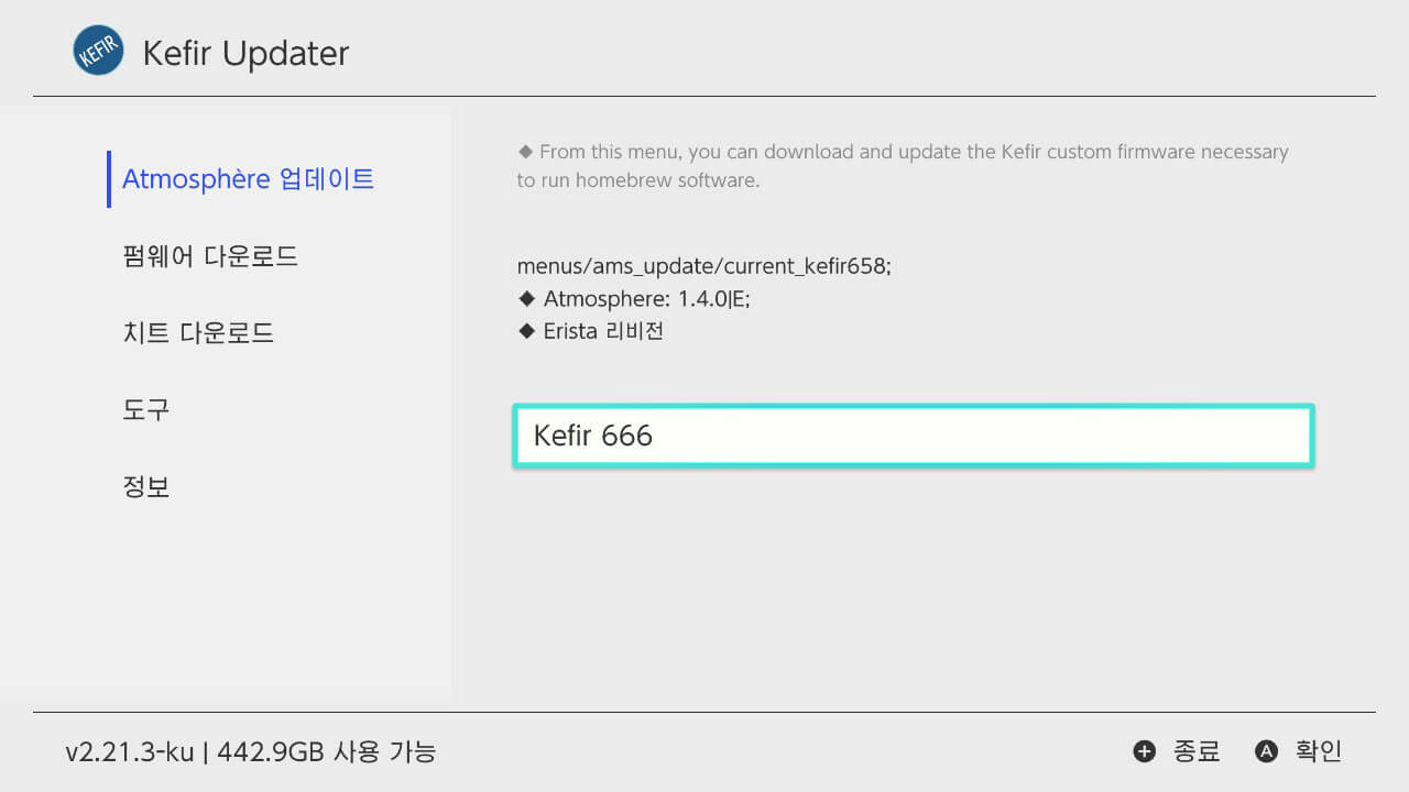 그러면 아래와 같이 홈브류로 들어가게 됩니다. 홈브류 화면에서 오른쪽으로 이동하다 보면 케피르 업데이트가 있습니다. A버튼을 눌러 들어가줍니다.