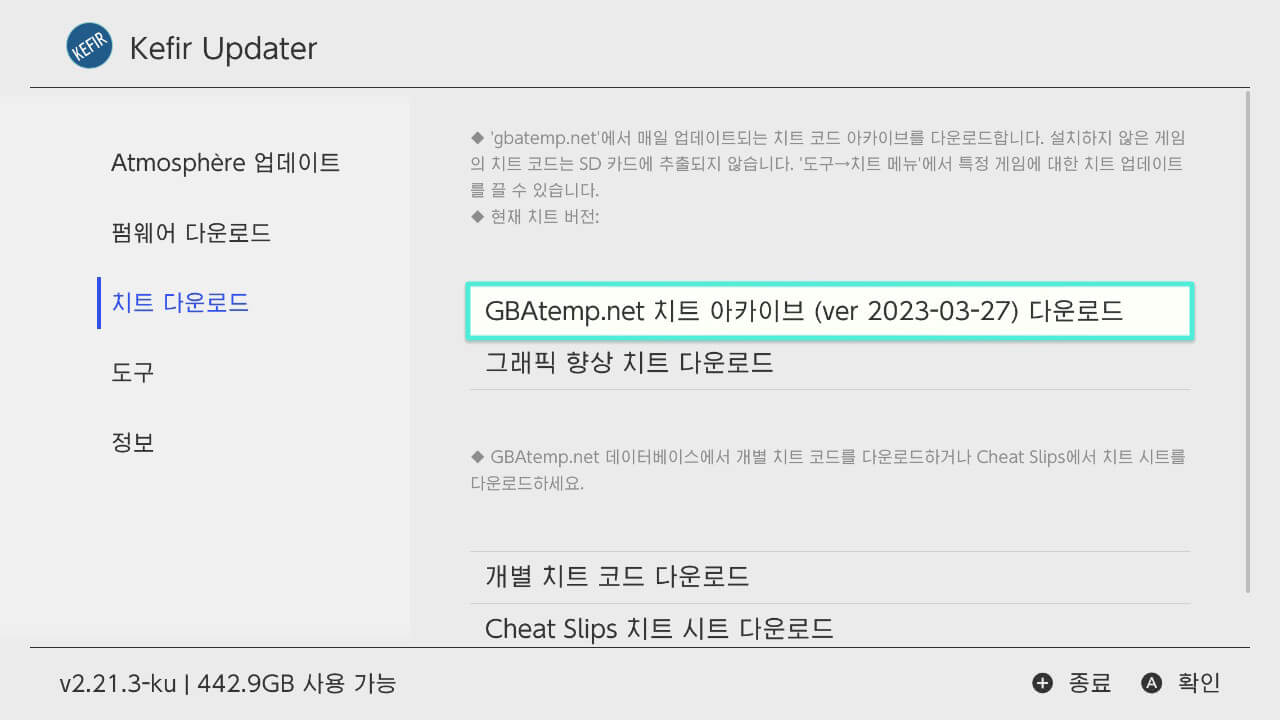 4개의 하위 메뉴가 나오는데 상단은 GBAtenp.net에서 계속 업데이트되는 최신 버전의 치트파일을 다운로드 받는 항목이고 하단의 개별 치트 코드 다운로드는 스위치 내에 설치된 개별 게임용 치트코드를 다운로드할 수 있습니다.
