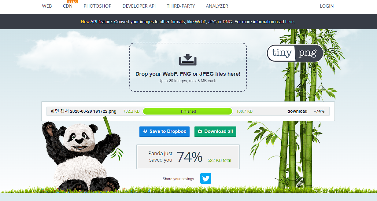 tinypng.com에 들어가 보겠습니다. 귀여운 판다다 대나무를 먹으며 맞이해 주는데 어떻게 사용하는지를 직관적으로 알 수 있습니다.