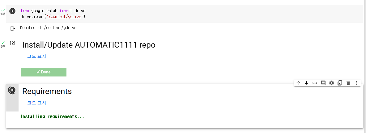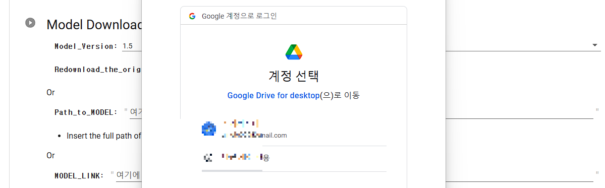 이제부터는 순서대로 몇 가지 항목을 실행해 주면 됩니다. 가장 먼저 상단에 있는 'from google colab으로 시작하는 문구 옆에 ▶ 아이콘을 클릭하세요. 해당 사항이 활성화되면서 액세스 허용을 묻는 창이 뜹니다. 구글 계정을 선택해서 연결해 주세요. 구글계정을 선택한 이후에 '허용' 여부를 묻는 질문에서도 '허용'을 선택해 주세요.