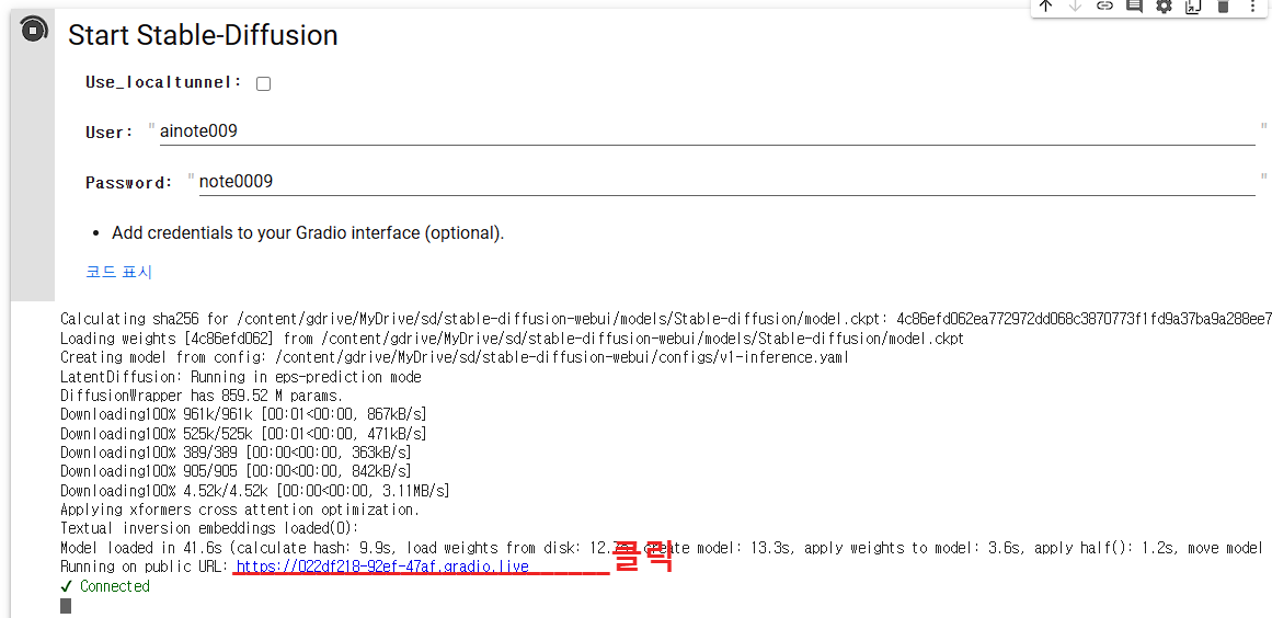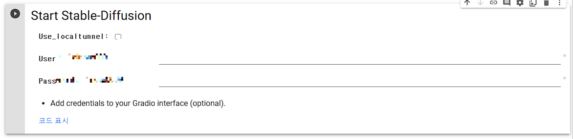 위의 URL을 클릭하면 드디어 구글코랩을 통해 스테이블 디퓨전이 시작됩니다. 시작 전 ID와 Password를 묻는 탭이 뜨는데 9번 란에 기입했던 ID와 Password를 기입하시면 아래와 같이 실행페이지가 뜹니다.