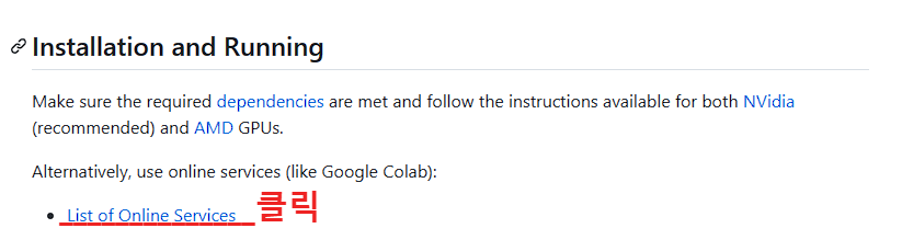 List of Online Services를 클릭하면 다음과 같은 화면이 나옵니다. 'Google Colab' 을 찾으시고 첫 번째 줄에 있는 'maintained by TheLastBen' 링크를 클릭하세요.