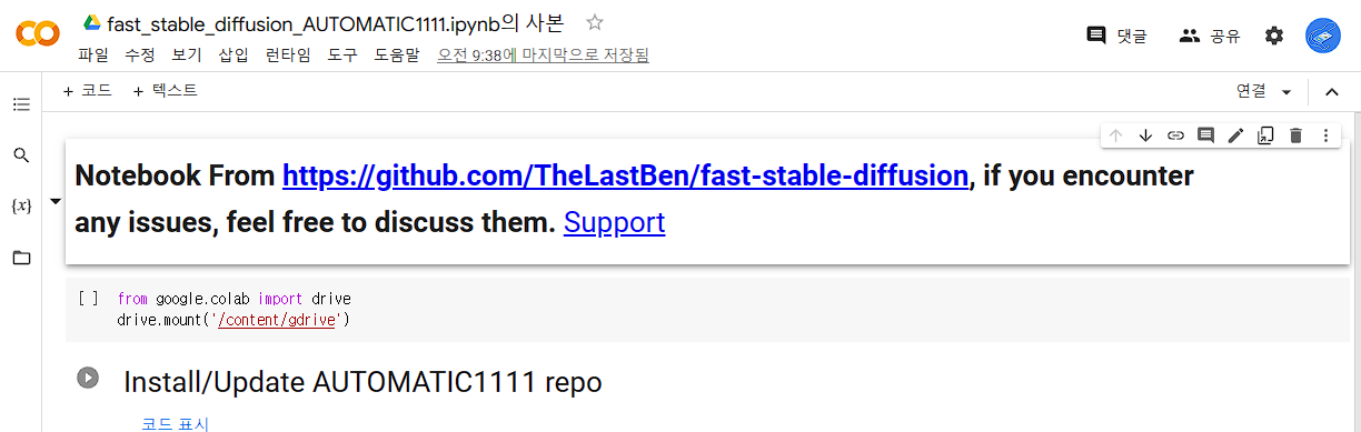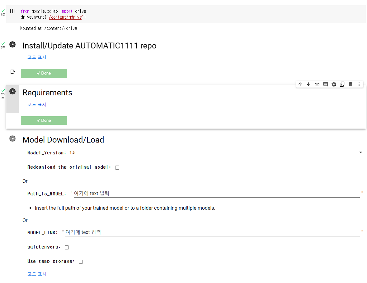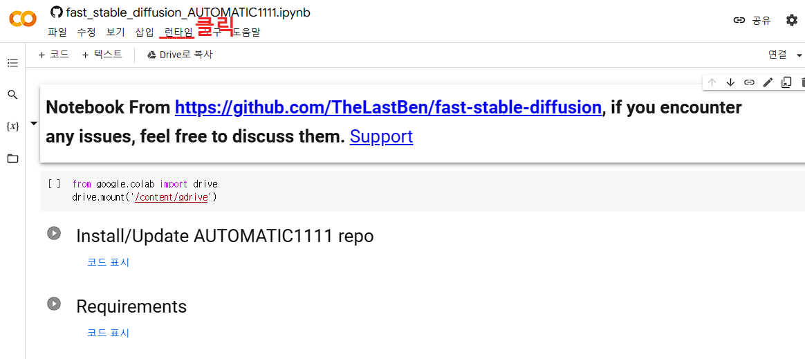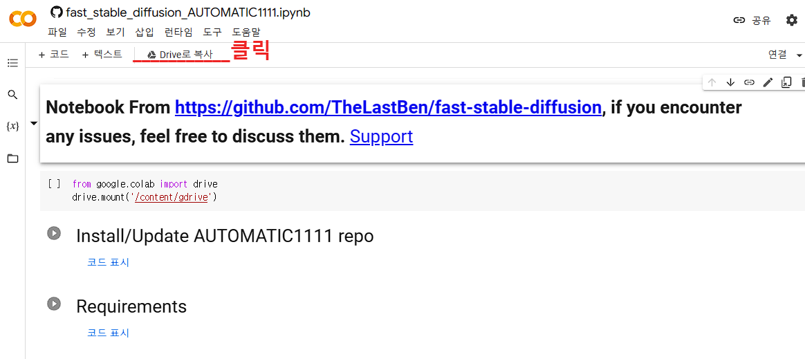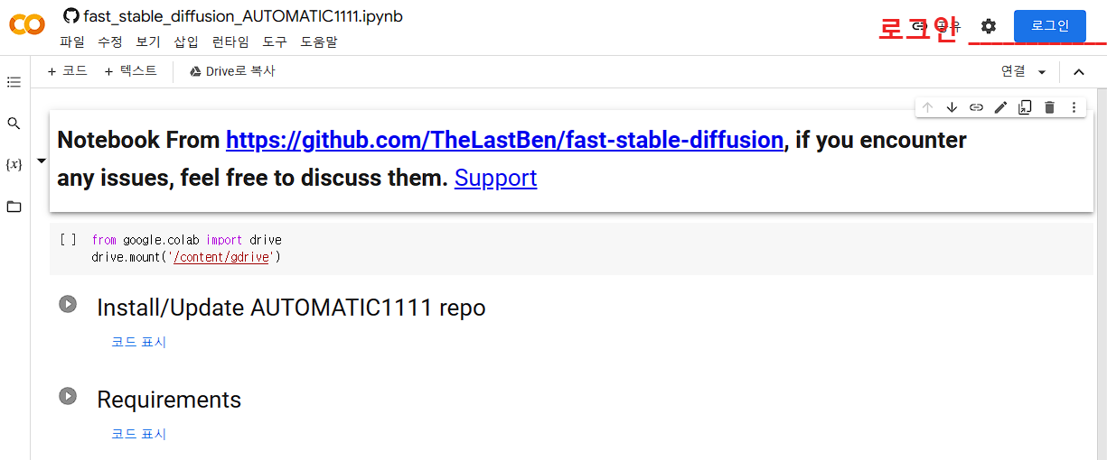 자 그럼 지금부터 구글코랩을 이용한 스테이블 드퓨전을 사용하는 방법을 소개해 드리겠습니다. 과정이 조금 많으나 천천히 하나하나 따라하시면 됩니다.