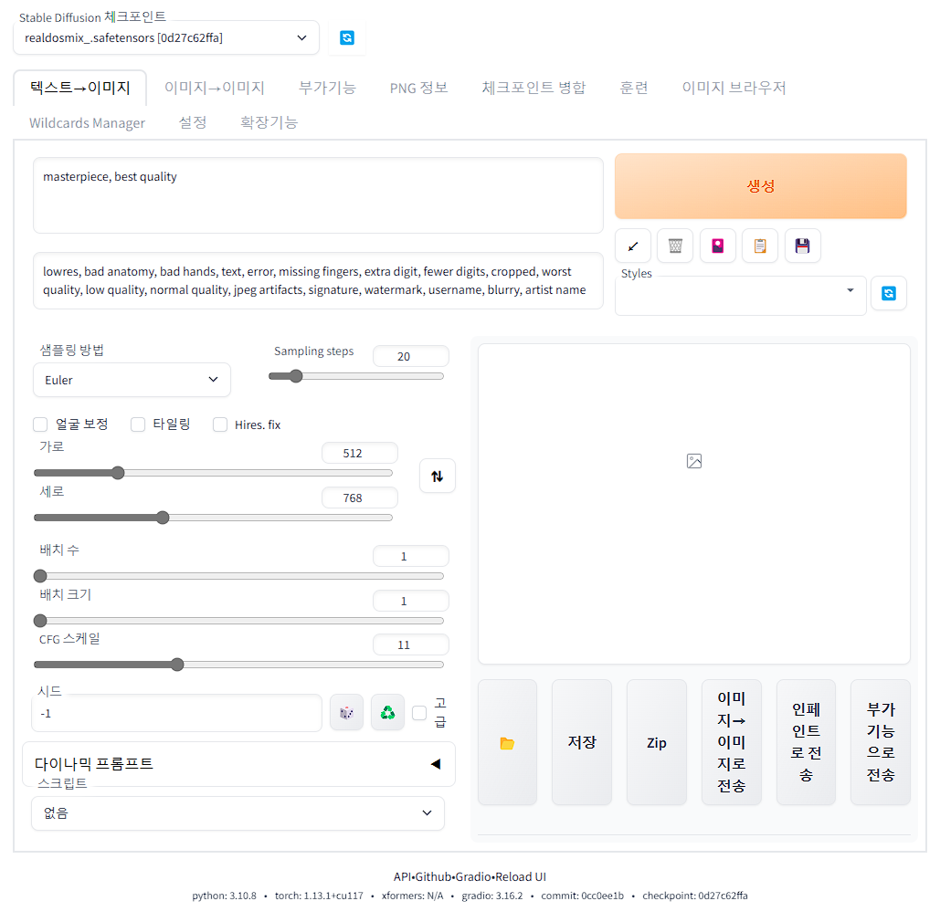 스테이블 디퓨전을 실행하면 다음과 같은 모습으로 실행됩니다.