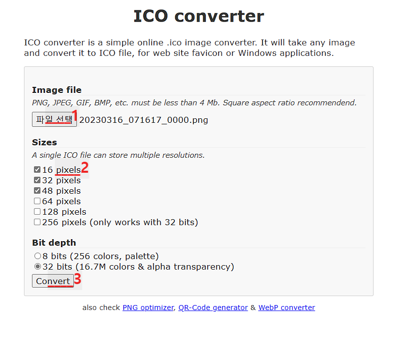 1) 파일선택에서 파비콘으로 만들 이미지를 선택하세요. (PNG, JPEG, GIF, BMP 파일들이 가능하나 파일크기가 4Mb 이하여야합니다.)