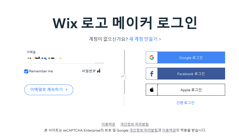 시작하기를 클릭하면 로고를 제작할 수 있다는 안내글과 함께 '로고제작' 버튼이 보입니다. 클릭해주세요. 아래와 같은 페이지가 나오게 됩니다. Wix 로고 메이커에 로그인 페이지입니다. WIix 계정을 가지고 계신 분은 계정으로 로그인을 해 주시고 처음이신 분은 회원가입을 해 주세요. 구글계정이나 페이스북 애플 계정으로도 계정을 만드실 수 있습니다.